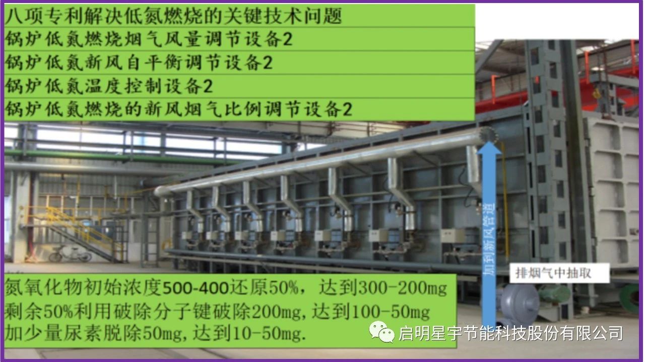 1.低氮燃燒部分(熱電廠普遍采用工藝):低氮燃燒也稱爐內脫氮,就是采用各種燃燒技術手段來控制燃燒過程中NOx的生成,又稱低NOx燃燒技術。采用自主發明的8項專利技術,鍋爐低氮燃燒煙氣風量調節設備2項專利;鍋爐低氮新風自平衡調節設備2項專利;鍋爐低氮溫度控制設備2項專利;鍋爐低氮燃燒的新風煙氣比例調節設備2項專利,降低NOx的燃燒排放濃度。