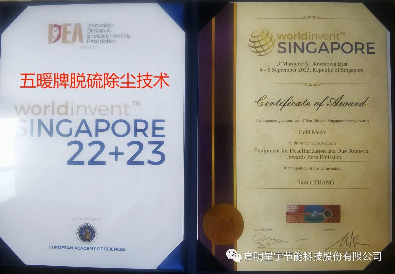 2023年9月新加坡國(guó)際發(fā)明展覽會(huì),授予五暖牌脫硫除塵脫硝一體化設(shè)備《全球原創(chuàng)發(fā)明獎(jiǎng)》,是對(duì)啟明星宇10年研發(fā)成果的肯定,同時(shí),體現(xiàn)出為全人類服務(wù)的能力和價(jià)值,專利技術(shù)轉(zhuǎn)化產(chǎn)品,全球原創(chuàng)唯一性,企業(yè)品牌得到進(jìn)一步提升!